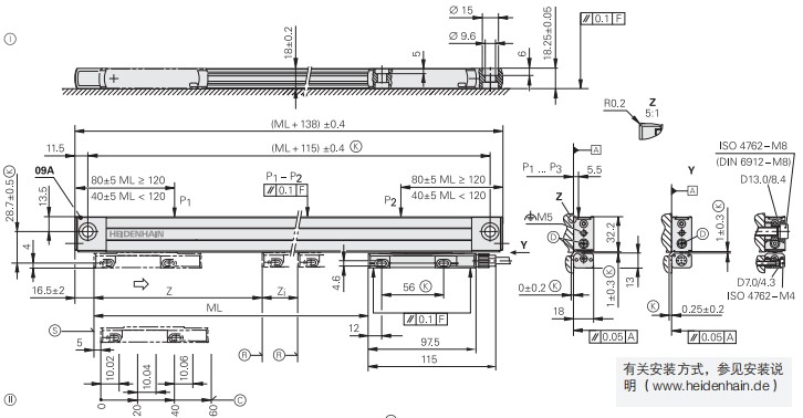 DIADUR玻璃光柵,柵距20 μm α therm ≈8 x 10-? K-1(安裝方式I/II);帶安裝板:α therm ? 9 x 10-? K-1(安裝方式III)